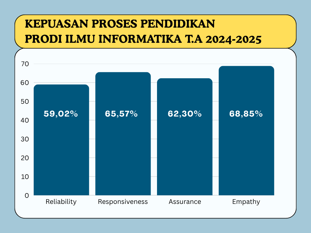 Survei mengenai kepuasan terhadap Proses Pendidikan menunjukkan bahwa mahasiswa program studi Ilmu Informatika memberikan tingkat kepuasan ‘Sangat Puas’ terhadap Keandalan (reliability), Data Tanggap (responsiveness), Kepastian (assurance), Empati (empathy).