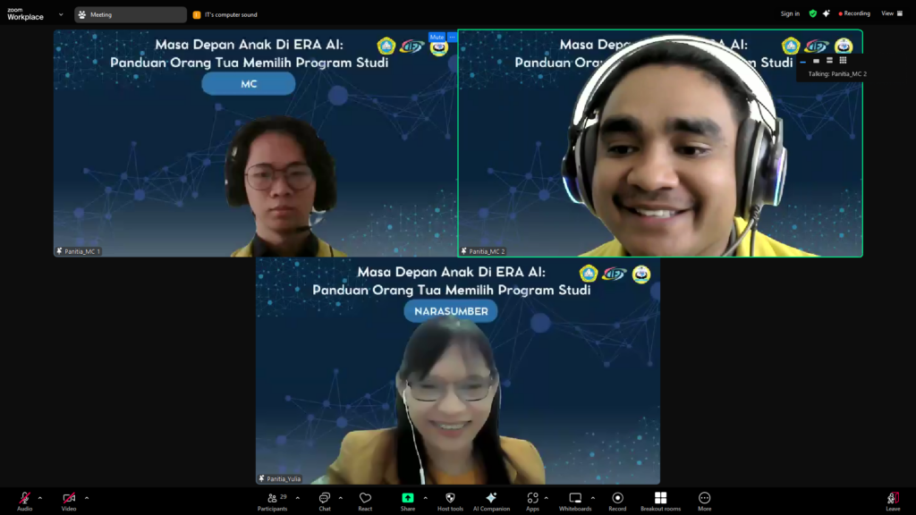 Pada Sabtu, 31 Mei 2025, Prodi Ilmu Informatika bersama dengan HIMA Ilmu Informatika mengadakan webinar Membantu Anak Memilih Karir Impian di Era Rtificial Intelligence (AI). Target pada webinar ini adalah orang tua dengan anak yang berada di kelas XII dalam menentukan pilihan studi dan karir.
