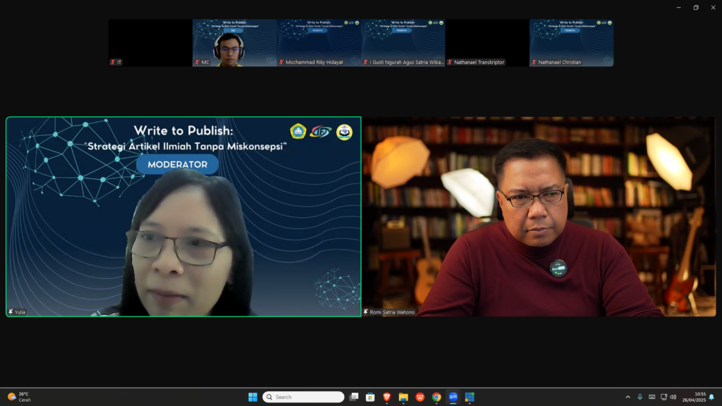 Sabtu, 26 April 2025, Prodi Ilmu Informatika mengadakan Webinar “Strategi Artikel Ilmiah Tanpa Miskonsepsi. Dengan Narasumber Dr. Romi Satria Wahono. B.Eng, M.Eng, Ph.D beliau merupakan founder dan CEO Brainmatics. Artikel ilmiah merupakan sarana penting untuk menyampaikan hasil penelitian secara sistematis dan dapat dipertanggungjawabkan. Namun, kesalahan pemahaman atau miskonsepsi sering muncul akibat ketidaktepatan dalam merumuskan konsep, metode, maupun interpretasi hasil. Oleh karena itu, diperlukan strategi yang tepat agar artikel ilmiah bebas dari miskonsepsi.