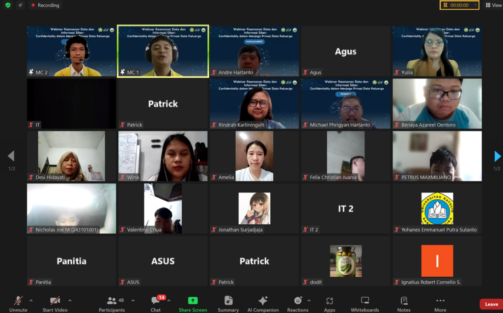 Pada Sabtu, 14 Juni 2025, Prodi Ilmu Informatika dengan HIMA Ilmu Informatika mengadakan Webinar Keamanan Data dan Informasi Siber dengan tema Praktik Confidentiality dalam menjaga privasi data keluarga. Webinar ini diselenggarakan sebagai sarana edukasi untuk meningkatkan kesadaran dan pengetahuan peserta mengenai risiko keamanan digital serta langkah-langkah pencegahan yang dapat diterapkan. Melalui webinar ini, peserta memperoleh wawasan tentang jenis-jenis ancaman siber, praktik keamanan data yang baik, serta strategi menjaga kerahasiaan, integritas, dan ketersediaan informasi.