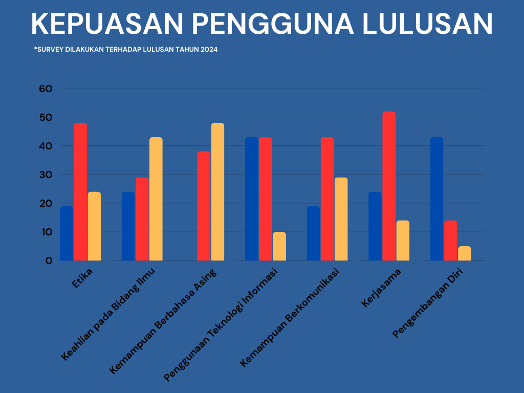 Kepuasan Pengguna Lulusan Tahun 2024 Prodi Ilmu Informatika dengan Jenis Kemampuan Etika, Keahlian pada Bidang Ilmu, Kemampuan Bahasa Asing, Penggunaan Teknologi Informasi, Kemampuan Berkomunikasi, Kerjasama, dan Pengembangan Diri. Dinilai dengan indikator Sangat Baik, Baik, Cukup dan Kurang.